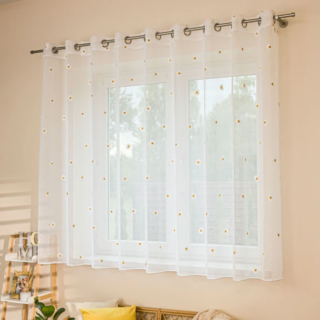 Hotová záclona z bílé etaminy s jemnou drobnou strukturou, zakončená olůvkem ve spodní části. Zdobená vyšívaným vzorem kopretin. Lehká a dívčí dekorace okna.