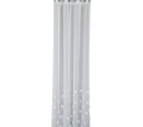 Hotová záclona z bílé etaminy s jemnou drobnou strukturou, zakončená olůvkem ve spodní části. Zdobená efektními stříbrnými mašlemi s třpytivými kamínky. Jemné zdobení jí dodává výjimečný charakter.