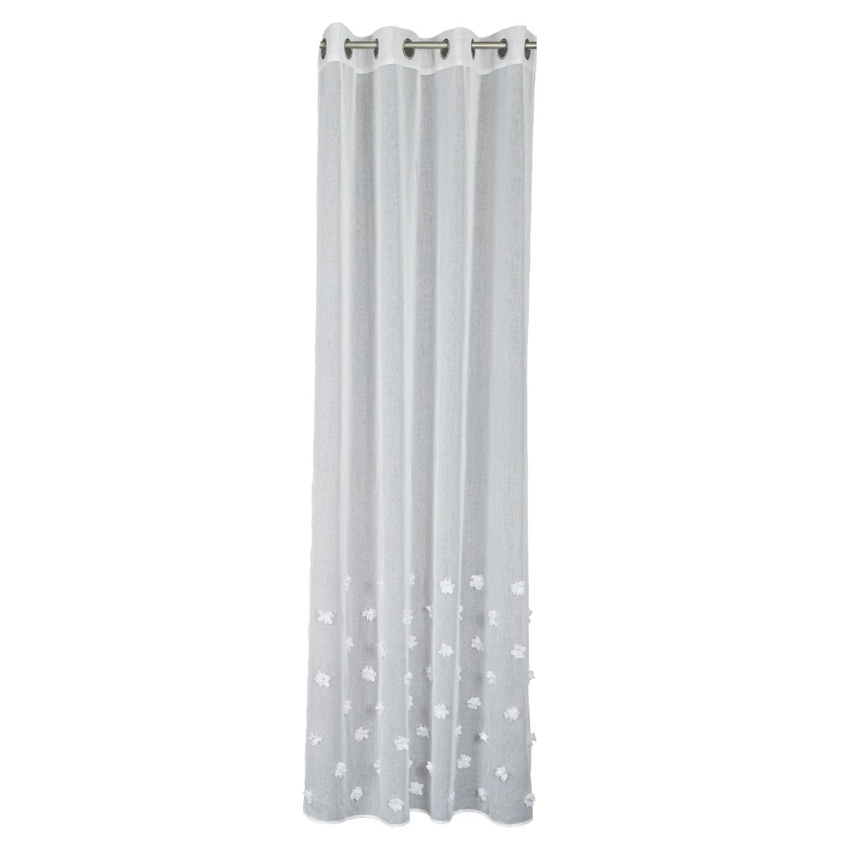 Hotová záclona z bílé etaminy s jemnou drobnou strukturou, zakončená olůvkem ve spodní části. Zdobená efektním trojrozměrným vzorem květů umístěným ve spodní části látky.