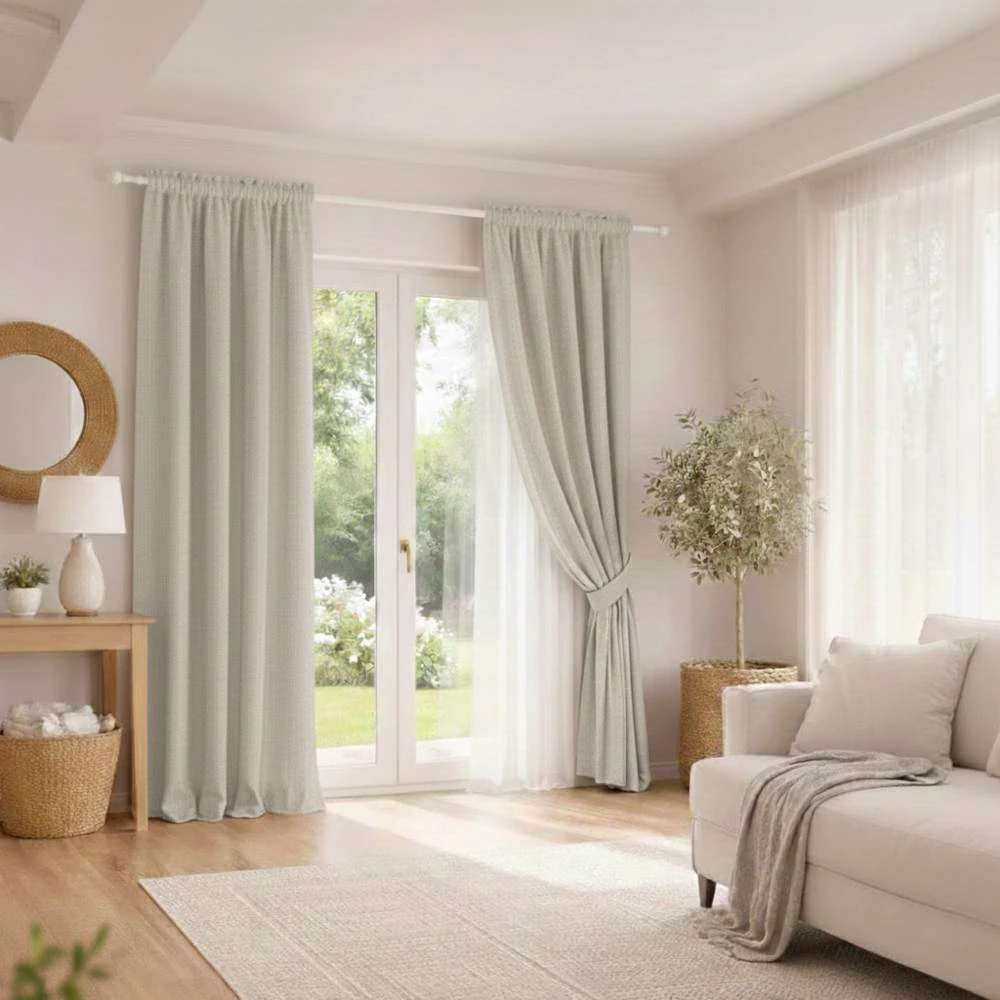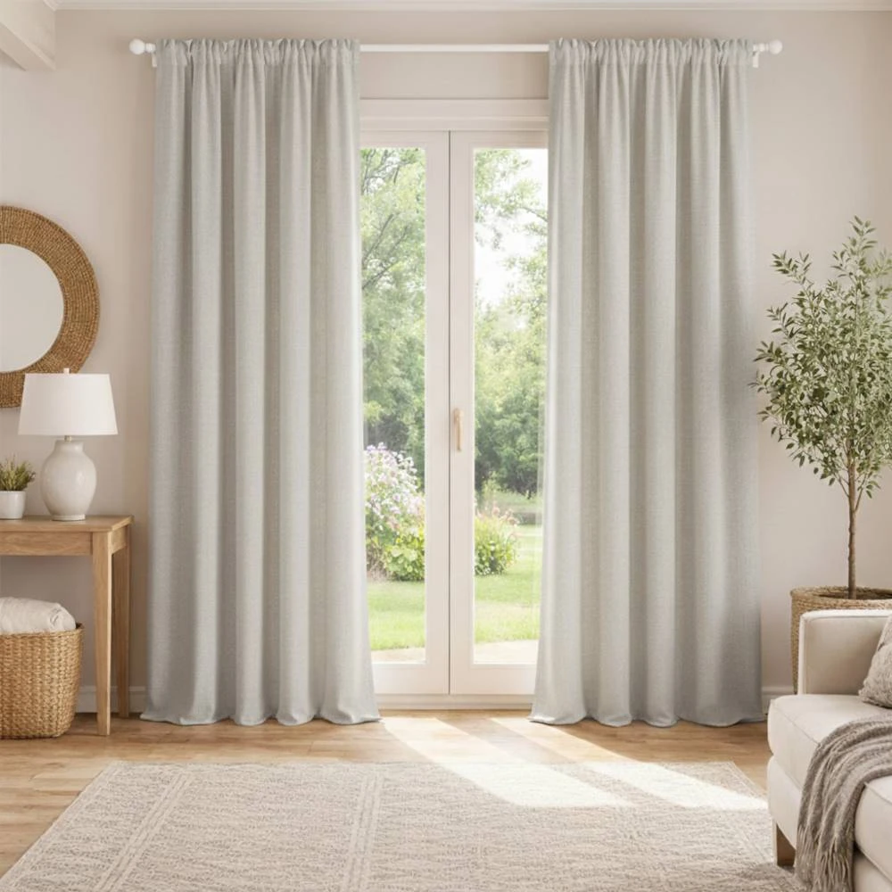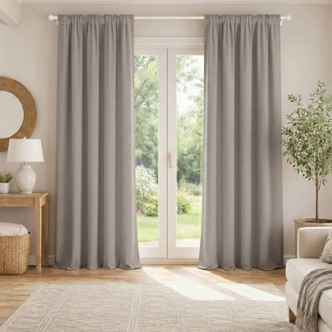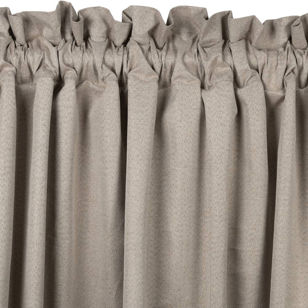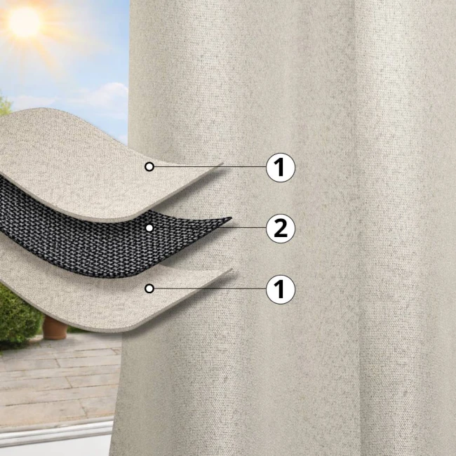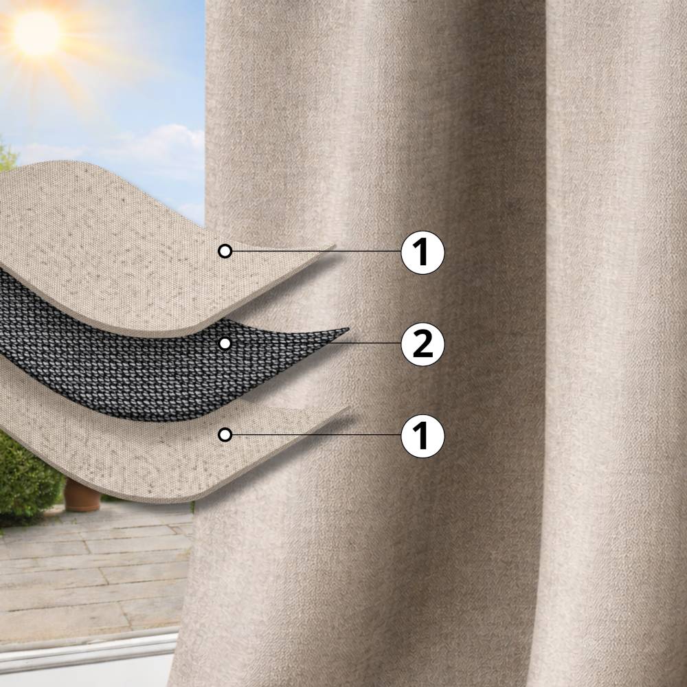 Závěs má elegantní, „přírodní“ strukturu připomínající len a polyesterová tkanina ho činí odolnějším. Závěs má 3vrstvou konstrukci, která zajišťuje 100% zatemnění.