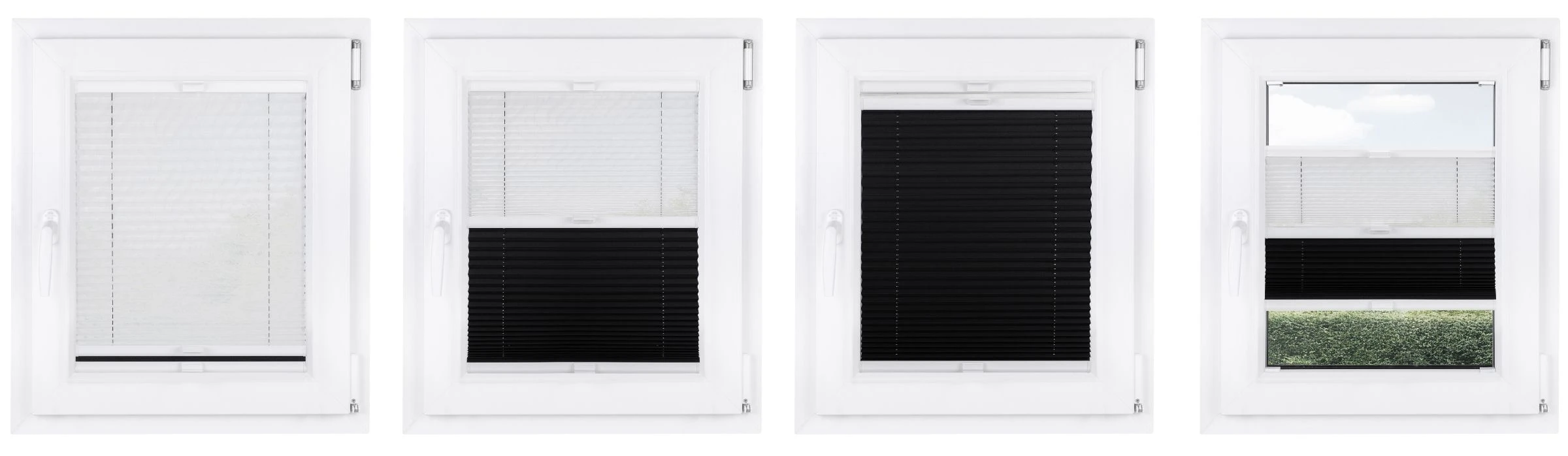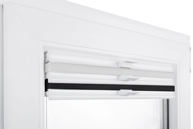 • Plisovaná roleta pro den a noc je kombinací dvou materiálů: transparentní, nahoře závěs a dole zatemňovací