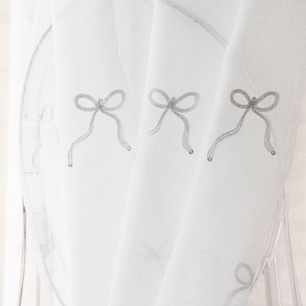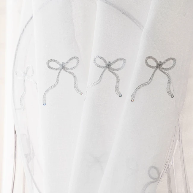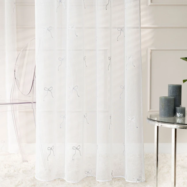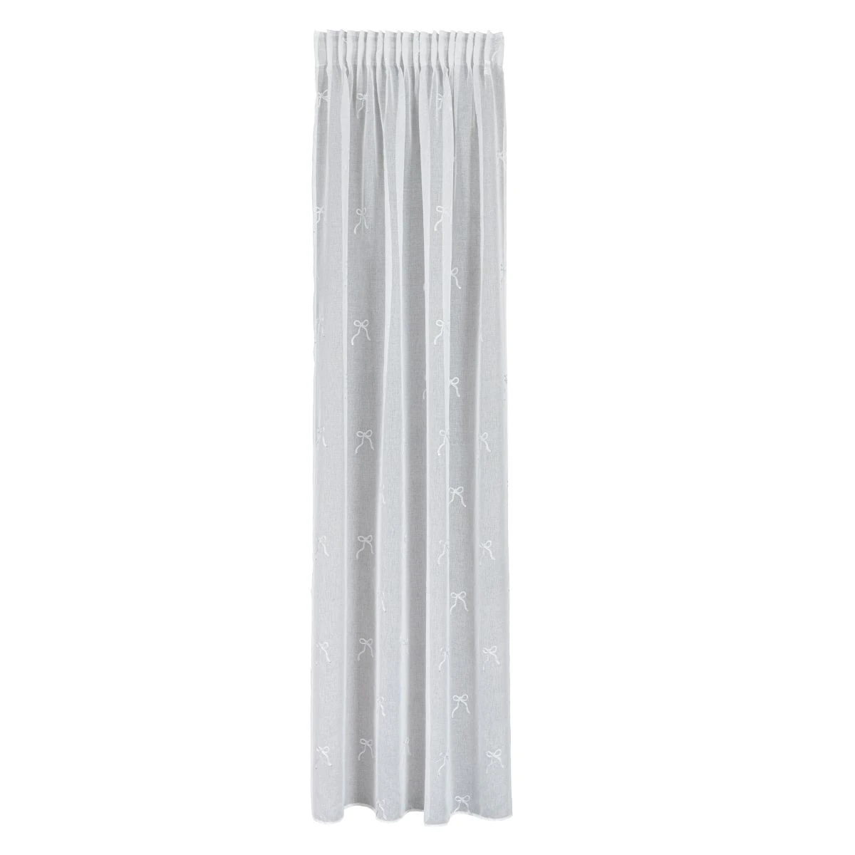 Hotová záclona z bílé etaminy s jemnou drobnou strukturou, zakončená olůvkem ve spodní části. Zdobená efektními stříbrnými mašlemi s třpytivými kamínky. Jemné zdobení jí dodává výjimečný charakter.