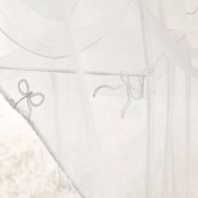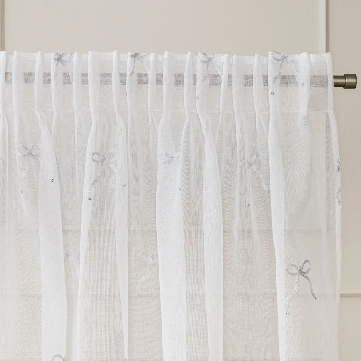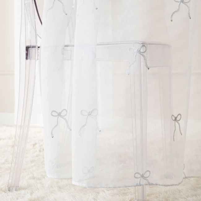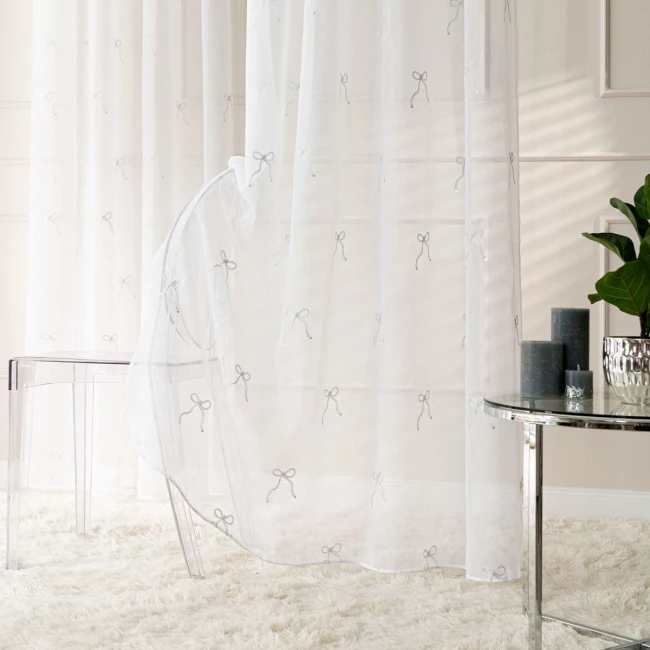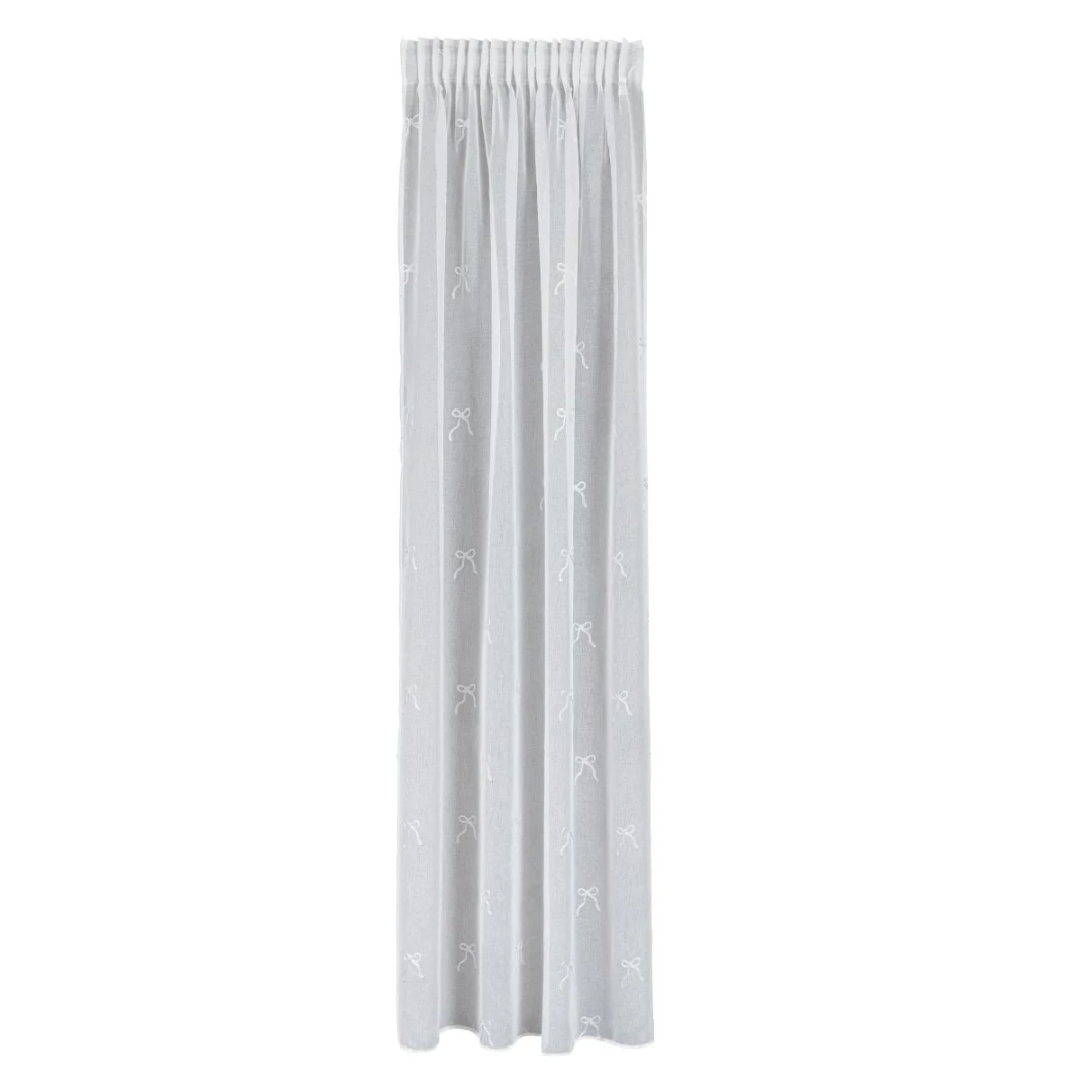 Hotová záclona z bílé etaminy s jemnou drobnou strukturou, zakončená olůvkem ve spodní části. Zdobená efektními stříbrnými mašlemi s třpytivými kamínky. Jemné zdobení jí dodává výjimečný charakter.